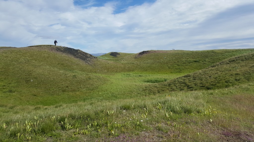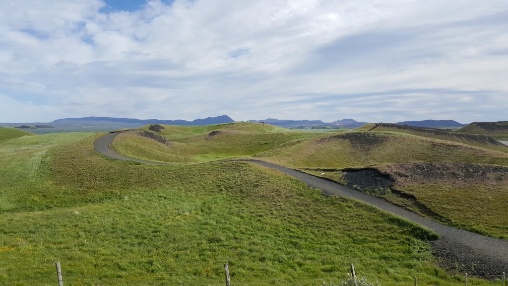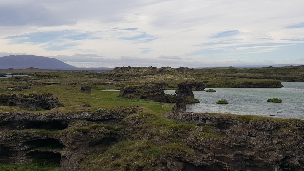 Als erstes ging es an die Südseite des Sees Mývatn da liegen die Skútustaðagígar, eine Reihe von atemberaubenden Pseudokratern. Diese Pseudokrater sind durch Gasexplosionen entstanden, bei denen schmelzende Lava über den Sumpfboden floss. Es gibt Wanderwege, die um die Krater herumführen und fantastische Ausblicke in alle Richtungen eröffnen.