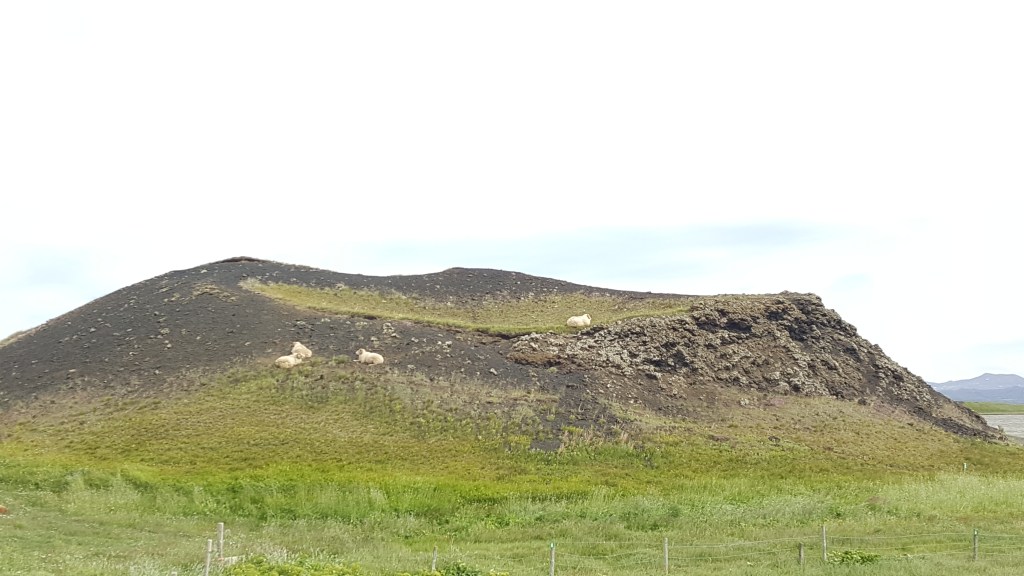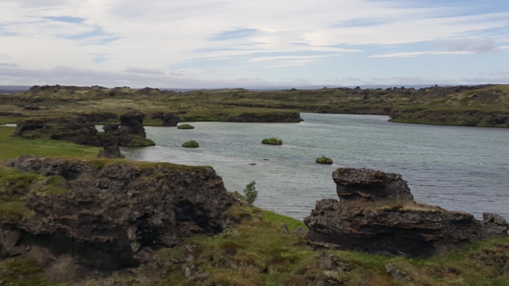 Als wir weiterführen kamen wir am Mývatn, ein 37 Quadratkilometer großer See in Nordisland vorbei. Mývatn wird übrigens als “Mückensee” übersetzt. Der Namen kommt nicht einfach soo daher. Es gibt im Sommer hier gleich zwei Perioden á zwei Wochen, in denen die Zuckmücken – die stechen immerhin nicht – am Ufer des Sees regelrecht schwarze Säulen bilden. Zum Glück sehen wir nur noch vereinzelnd Mücken…