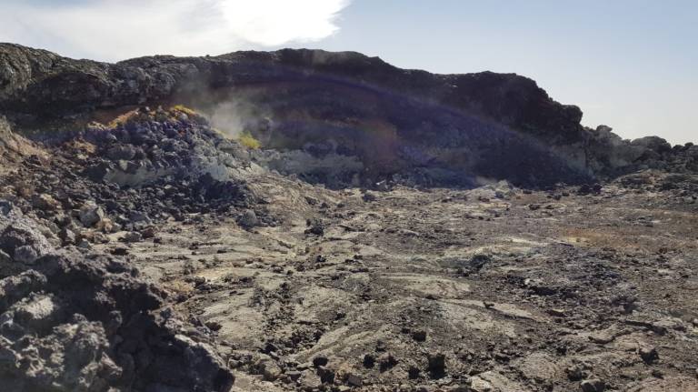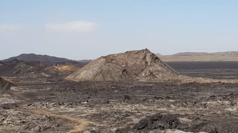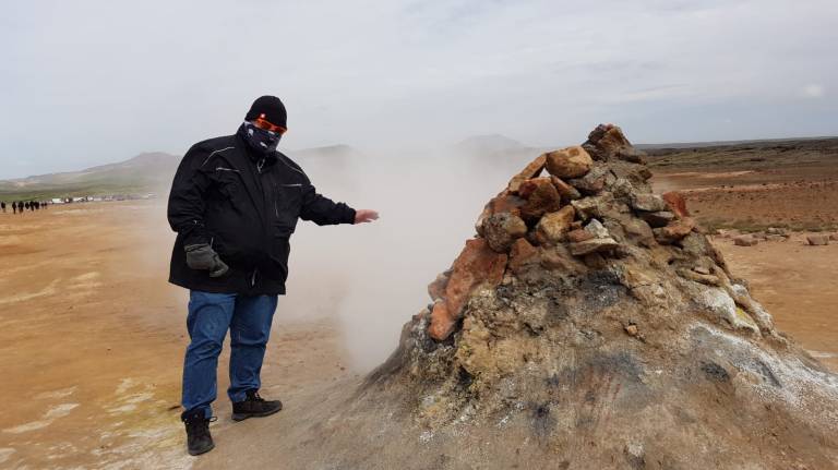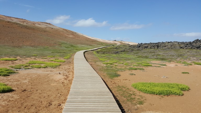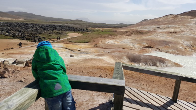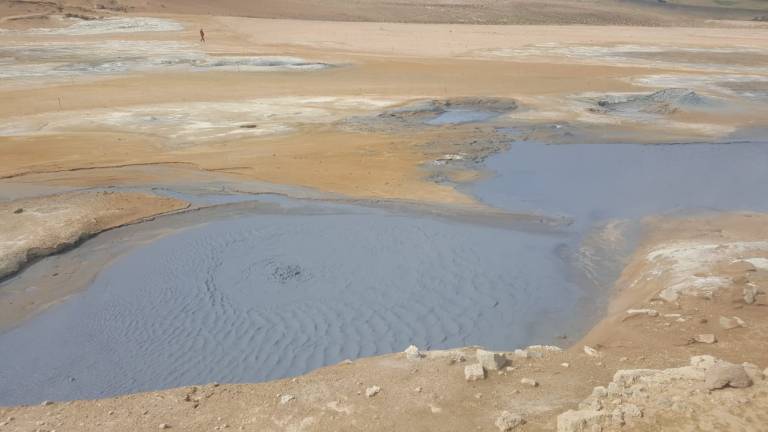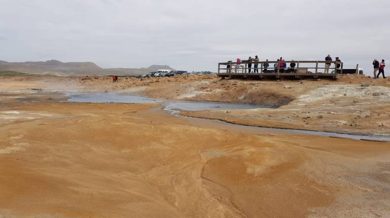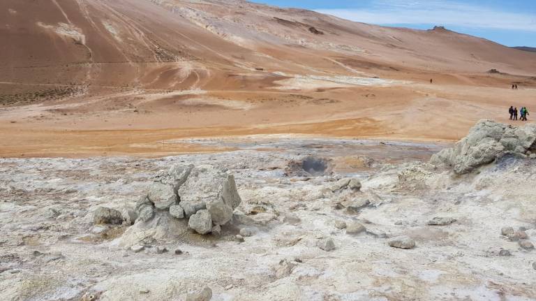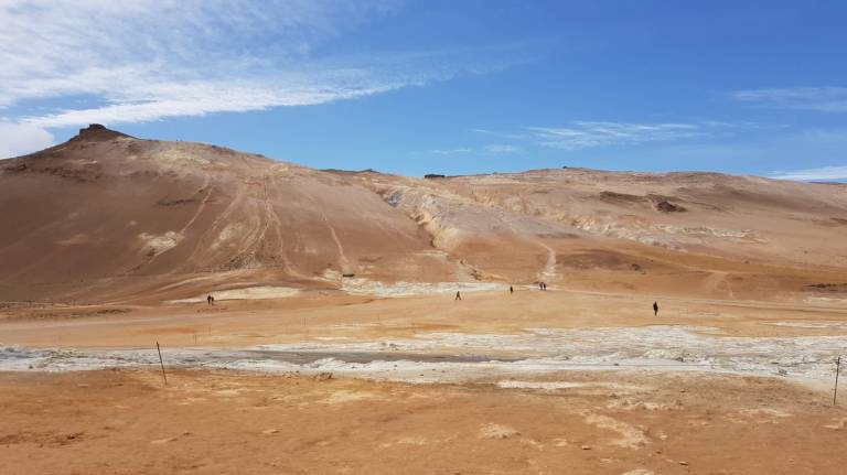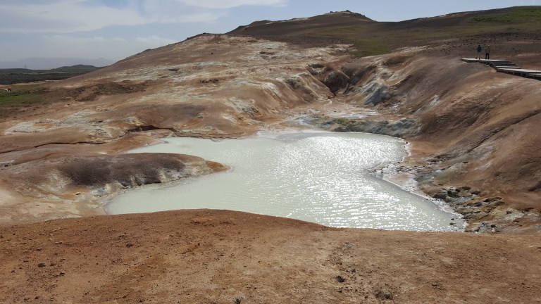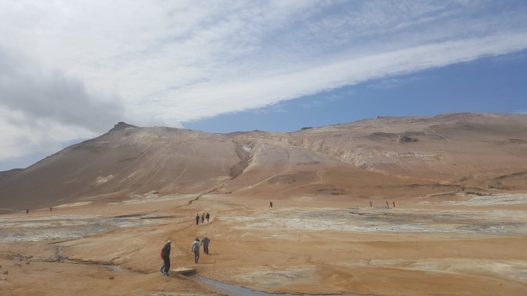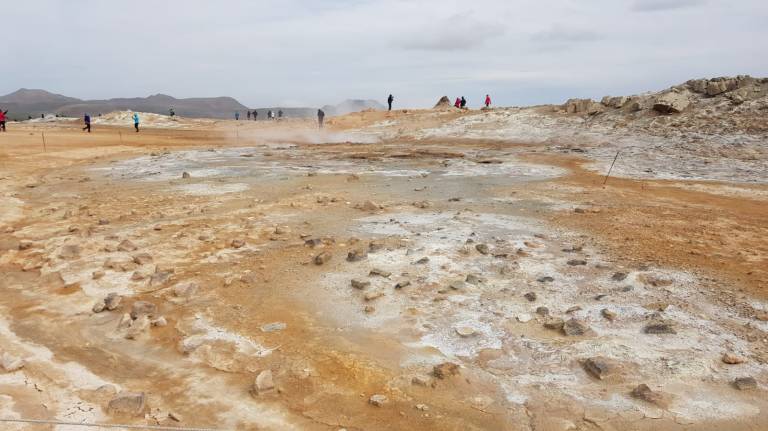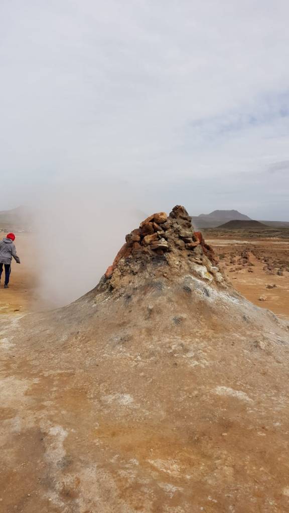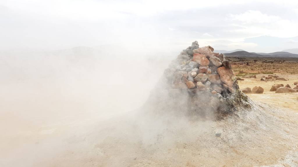 Als wir bei der Vulkanlanschaft Námafjall ankamen und ausstiegen mischte sich in die kühle, frische Luft ein leichter Gestank nach Schwefel, der immer stärker wird, je näher man den Fumarolen und Schlammtöpfen kommt. Bis es einem schließlich fast den Atem raubt. Der rote Sand unter meinen Füßen wirbelt bei jedem Schritt auf und setzt sich auf Schuhen und Kleidung nieder. Rechts und links von mir zischt und blubbert es abwechselnd und aus diversen Löchern steigt Dampf auf. Aus zahlreichen Schlammtöpfen brodelt es. Dunkle Wolken ziehen tief über die Ebene hinweg. Hverarönd am Fuße des Námafjall ist eines von vielen Hochtemperaturgebieten der Insel, aber das mit Abstand spektakulärste. Markierte Wege führen durch die lebensfeindliche Landschaft.