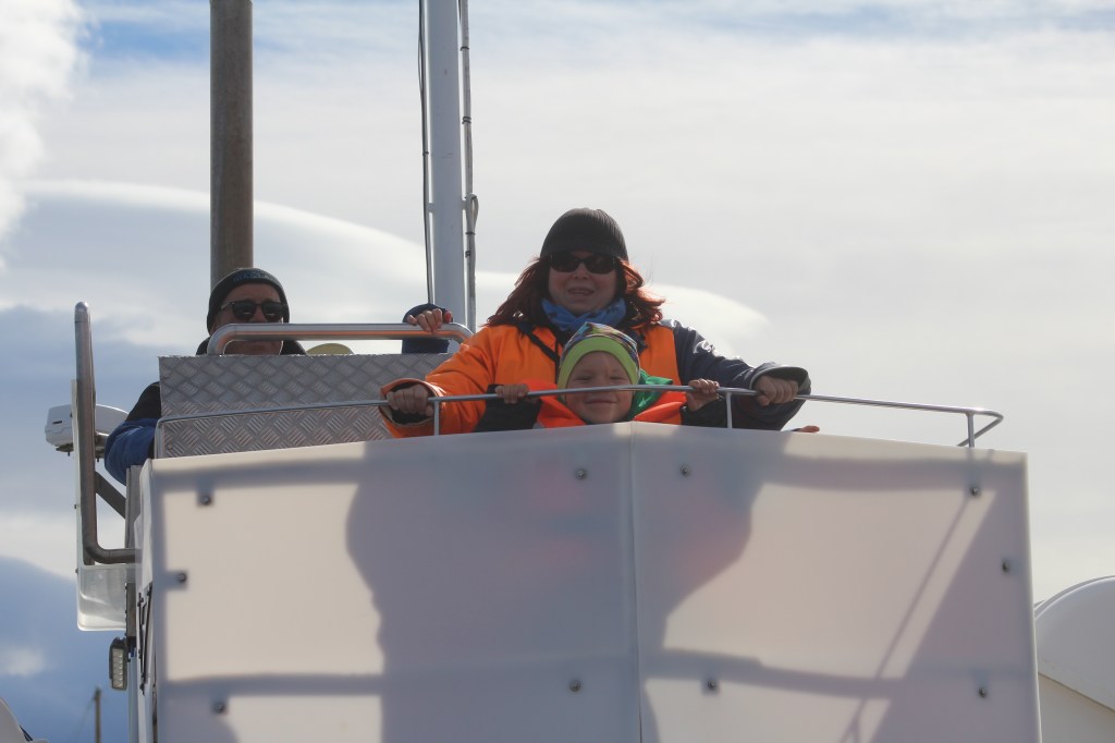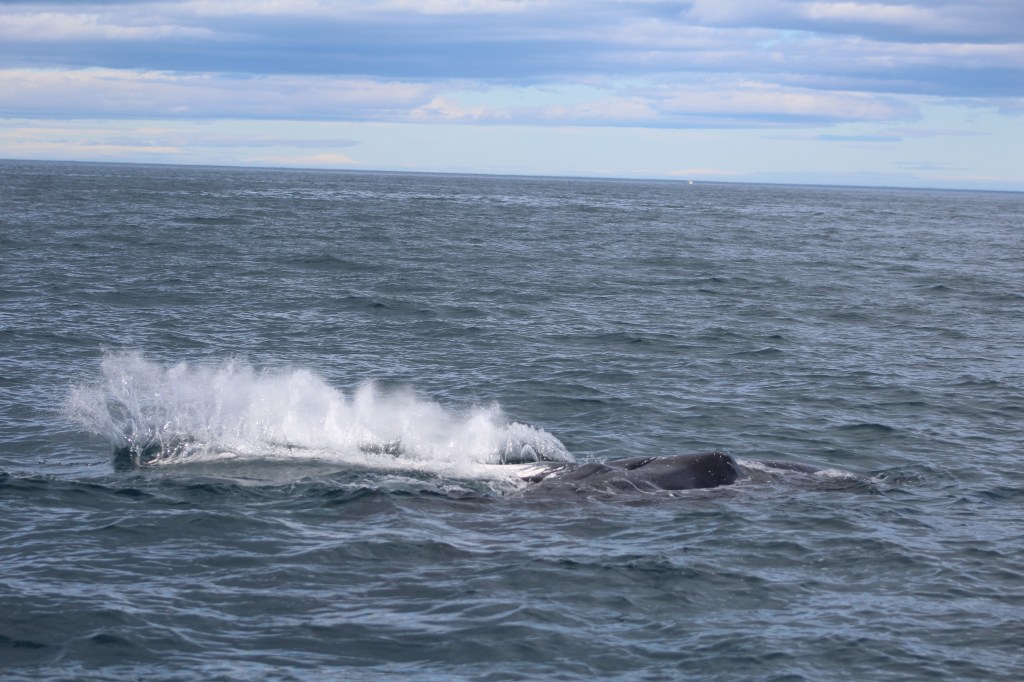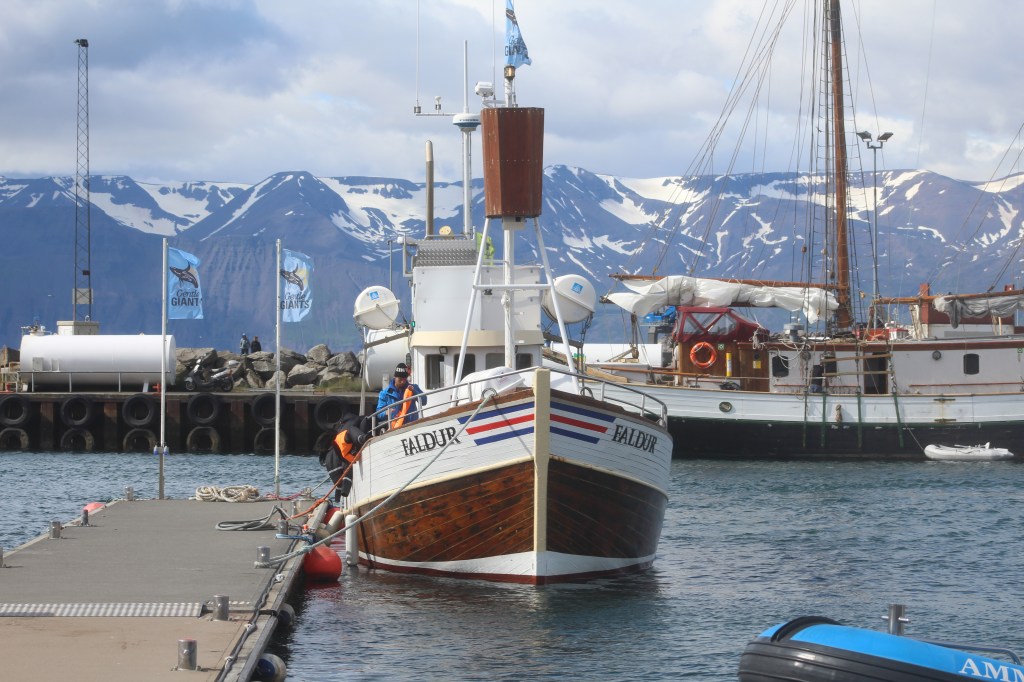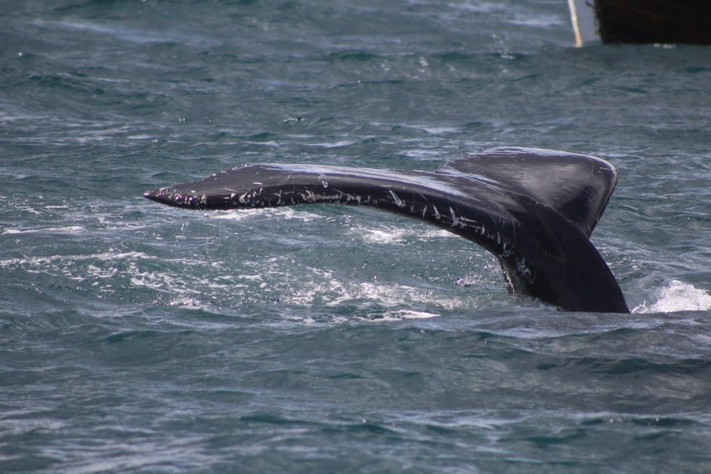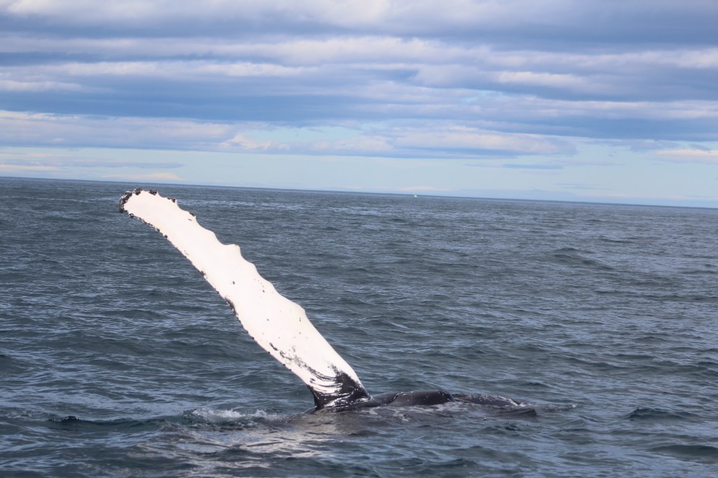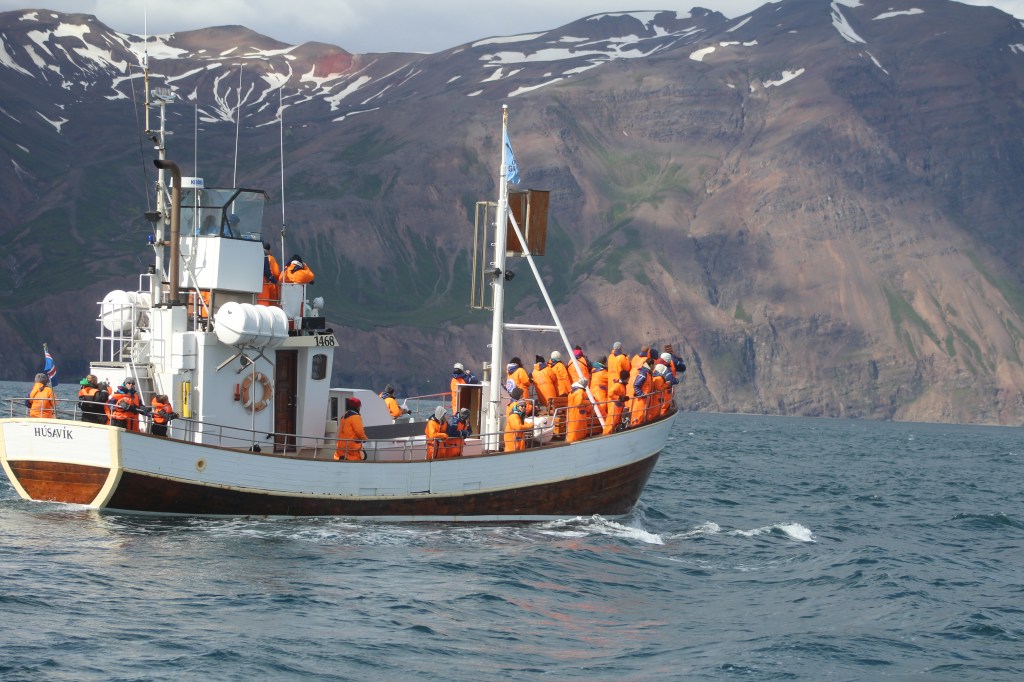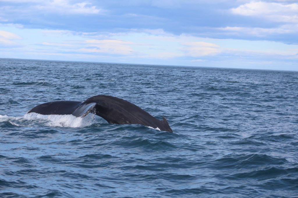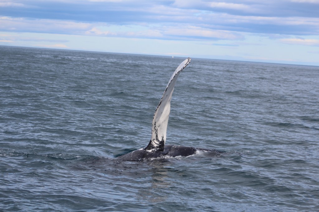 Heute Morgen müssten wir ziemlich früh raus , da mir um 8.30 in Husavik sein sollten. Da wir eine Whalewatching Tour gebucht haben. Auf diesen Tag waren wir sehr gespannt und neugierig. Hoffentlich sehen wir Wale das wäre soo toll. Als wir in Husavik ankamen und zum Hafen runterkamen. Dachten wir nur Wow das Bild vor uns wie auf einer Postkarte. Vor mir liegen die schneebedeckten Fjorde, hinter mir spiegeln sich die Schiffe im Hafen im eisblauen Wasser. Alles wirkt wie eine Postkarte – und wir mittendrin. Und dann geht es auch schon aufs Schiff. Und da wären wir also, das Meer ist ein bisschen rauer aber da müsste ich durch. Noch fehlt von den Walen jede Spur. Unsere Tourguide erklärt uns, dass wir alle besonders auf Vogelschwärme achten sollten, denn die halten sich besonders gerne dort auf, wo sich Wale befinden. Doch am Horizont sieht man nichts. Wir dürften dann hoch zum Kapitän zum besser schauen mein Sohn fand das super….