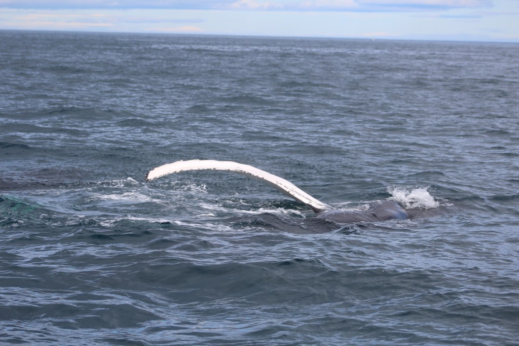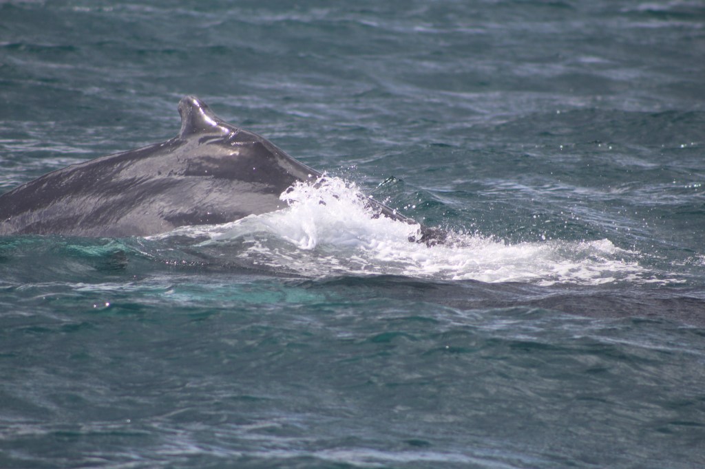 Und siehe da, plötzlich würde mein Sohn nervös und meint er hat soo ein Wasserföntane gesehen und tatsächlich tauchte da ein Buckelwal auf. Und noch einer. Immer wenn die Wale ihren Rücken stark krümmen, machen sie sich für einen tiefen Tauchgang bereit und etwa fünf Minuten später an einer beliebigen Stelle wieder aufzutauchen. Der Buckelwal meint es gut mit uns und taucht die nächste halbe Stunde immer wieder rechts und links des Bootes auf. Oder ist es bereits einer seiner Artgenossen? Ich bin jedenfalls völlig hin und weg und kriege vor lauter Aufregung kaum ein brauchbares Motiv aus meiner Kamera. Es war soooo schön…
