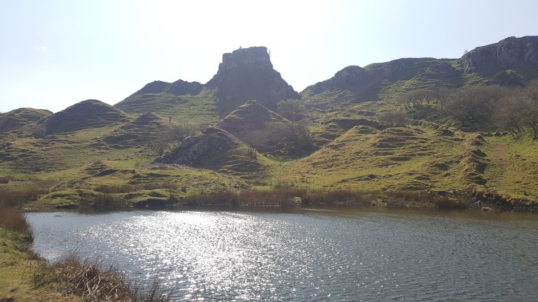 Fairy Glen wo die Feen leben auf der Isle of Skye sagt man. Für das Fairy Glen bei Uig haben sich die Feen besondere Mühe gegeben. Kleine Tümpel mit Seegras schmiegen sich um geriffelte Kegel. Bäume greifen mit langen Finger ins Nichts. Kleine Bäche und Wasserfälle winden sich durch abgeschiedene Täler. Über allem hält die Castle Ewen Wache. Castle Ewen ist keine Burg sondern ein hoch aufragender Fels mitten im Tal. Doch er hat tatsächlich Ähnlichkeit mit einem Wachturm oder einer kleinen Festung. Mutige können ihn sogar über einen kleinen Pfad erklimmen, er bietet oben genug Platz um sich sicher aufzuhalten – sich vielleicht sogar die Sonne auf den Bauch scheinen zu lassen. Falls es die Wetterfee gut mit einem meint. Das Fairy Glen ist einer der wunderschönsten Ort auf der Isle of Skye. Und es ist noch keine überlaufene Touristenattraktion. Zur rechten Zeit und mit etwas Glück kann man es mit einem Spaziergang ganz alleine erkunden.