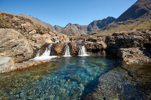 Am Fuße der Black Cuillins befinden sich die Fairy Pools, die aus einer Aneinanderreihung von vielen kleineren und größeren Wasserfällen, Kaskaden und Pools verteilt über eine Strecke von ein paar Kilometern bestehen. Nach einer Sage der Einheimischen soll dies der Ort sein, an dem Feen leben. Wenn man sich das türkis-blaue und zugleich kristallklare Wasser so anschaut, bekommt man daran keine Zweifel. Das war soo für mich der richtige Abschluss von einem sehr eindrucksvollen Tag